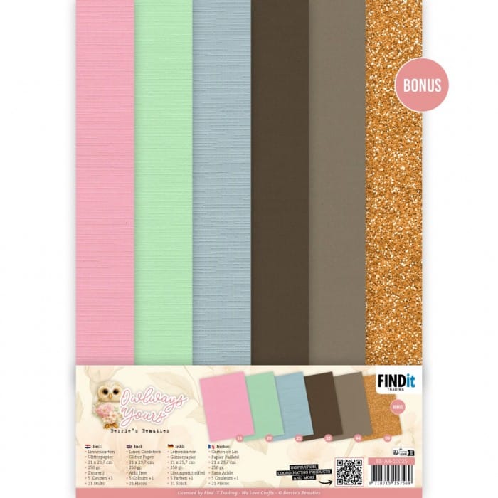 Linnenkarton pakket, passend bij de collectie Owlways Yours. 20 vel + 1 bonus, 21 x 29.7 cm, 240 grams. Pakket bevat 5 kleuren x 4 vel: Roze, middengroen, grijs, chocoladebruin, mokka, bonus: 09 Glitter Bronze